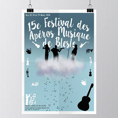 Ce travail a été réalisé en cours d'infographie. Il a pour but la réalisation d'un visuel destiné à la promotion du Festival 2016 des Apéros Musique de Blesle qui aura lieu les 12, 13 et 14 août 2016 et dont l'essentiel de la communication se fera sous forme d'affichage en ville, de programmes, de flyers et sur le site internet des Apéros Musique.